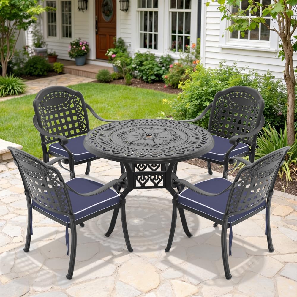 Enhance your outdoor living space with this durable cast aluminum dining set designed for year-round enjoyment. Crafted from premium cast aluminum, this set offers exceptional strength, rust resistance, and lightweight handling—ideal for frequent rearranging or seasonal storage. The smooth swivel mechanism on each chair allows effortless rotation, adding comfort and convenience during meals or casual gatherings. The round table features a stable base and balanced weight distribution, ensuring steady performance even on slightly uneven surfaces like patios, decks, or garden pavers. Surface finishes are carefully applied to withstand sun exposure, light moisture, and everyday wear—no special coatings or maintenance required for routine use. Assembly is straightforward with included hardware and clear instructions; no power tools needed. All components are precision-cast for consistent quality and long-term structural integrity.